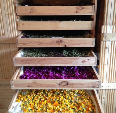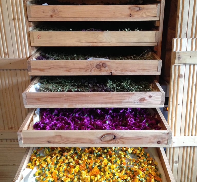 La plupart des plantes utilisées à la distillerie sont séchées. Pauline utilise un séchoir qui respecte parfaitement les arômes des plantes.